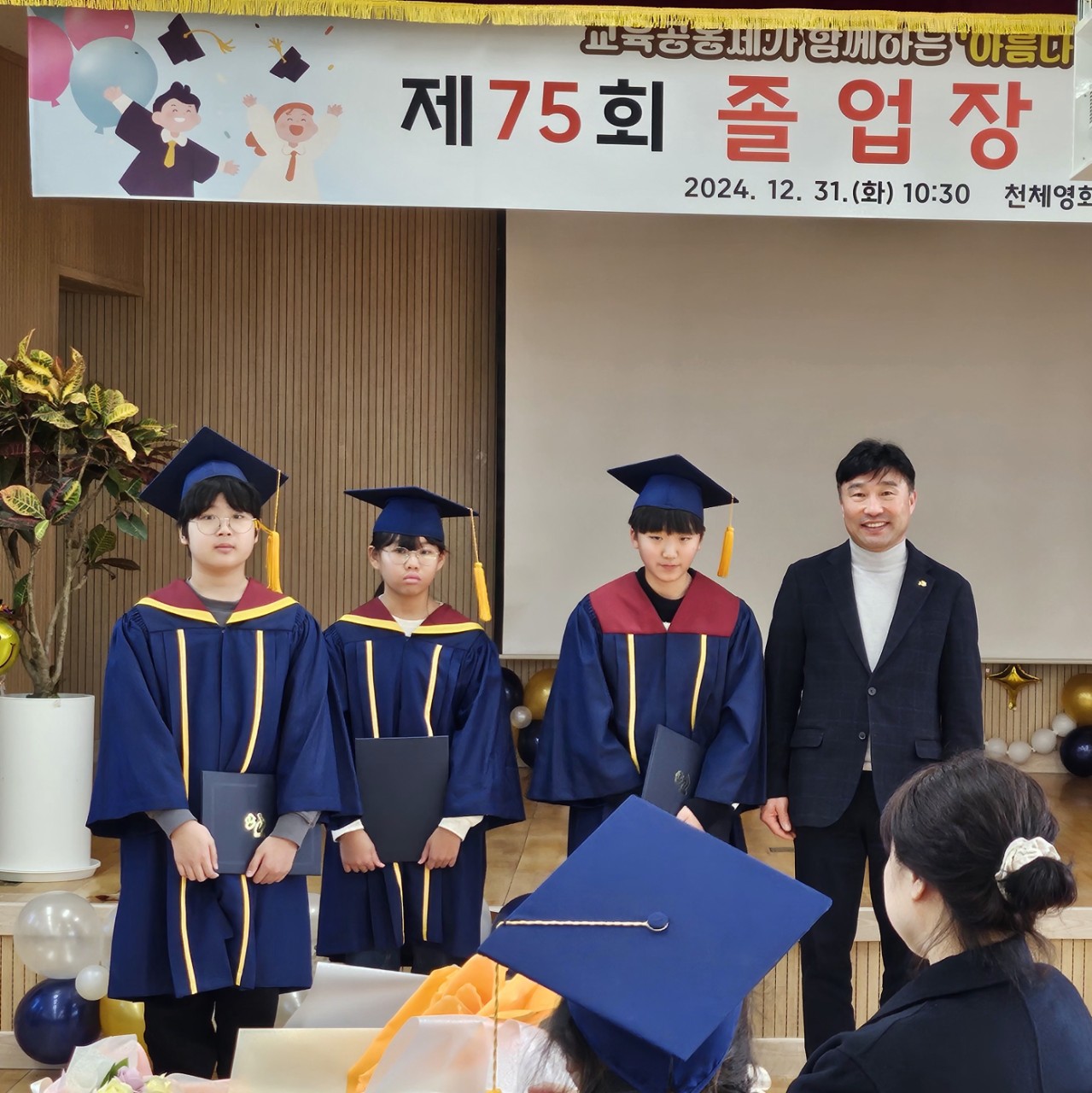 ▫️일시: 12월 31일(화) 오전 10시30분▫️장소: 석정초등학교 천체영화관제75회 석정초등학교 졸업식에서 사단법인 일만이 석정초 추천 모범학생 3명(졸업생)에게