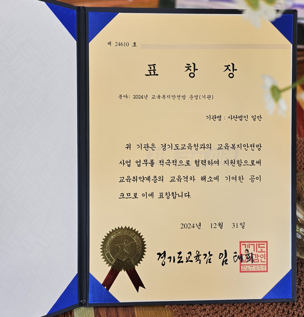 사단법인 일만이 교육복지안전망의 운영에 기여한 공으로 경기도 교육감 표창장을 수상하였습니다.